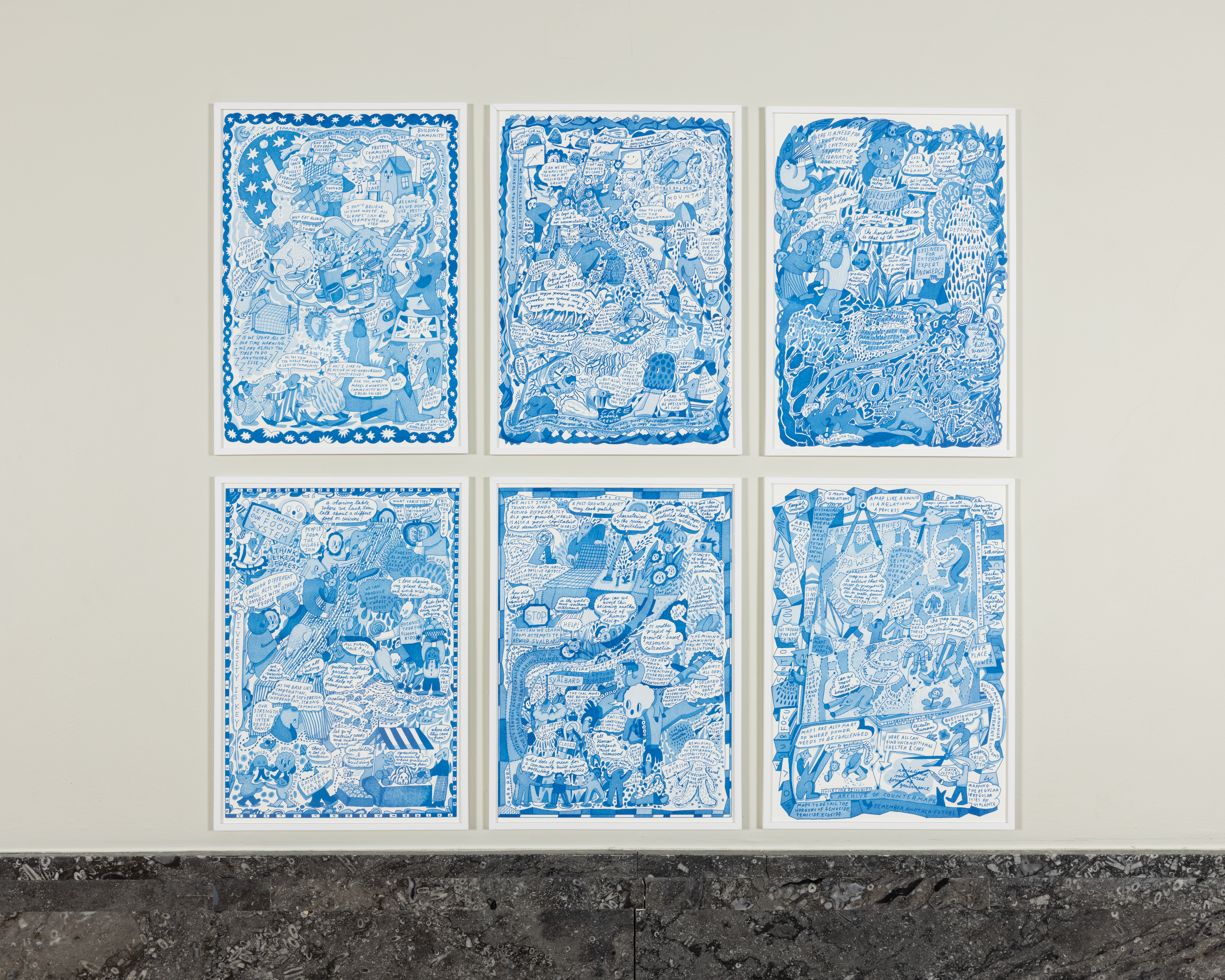 12 A2 Risoprints, 13 sound recordings, 4 wooden benches in the shape of a caterpillarThese are not blueprints—takes its starting point in the degrowth movement in economics and political ecology. In the sonic piece, visitors can listen to interviews and conversations with various researchers within the degrowth milieu. The movement critiques humanity’s compulsive hunger for growth, which, as argued by the movement’s supporters, should not be an end in itself. Degrowth, both as a concept and a theory, aims to reduce economic growth, resource consumption, and energy use in wealthy economies while fostering the growth of developing economies to achieve sustainable living standards. Degrowth does not equate to radical visions of living in a hole in the woods, but slower, simpler, and meaningful living. The movement prioritizes the well-being of humans and more-than-human others over unsustainably growing economies, moving towards post-growth world.
